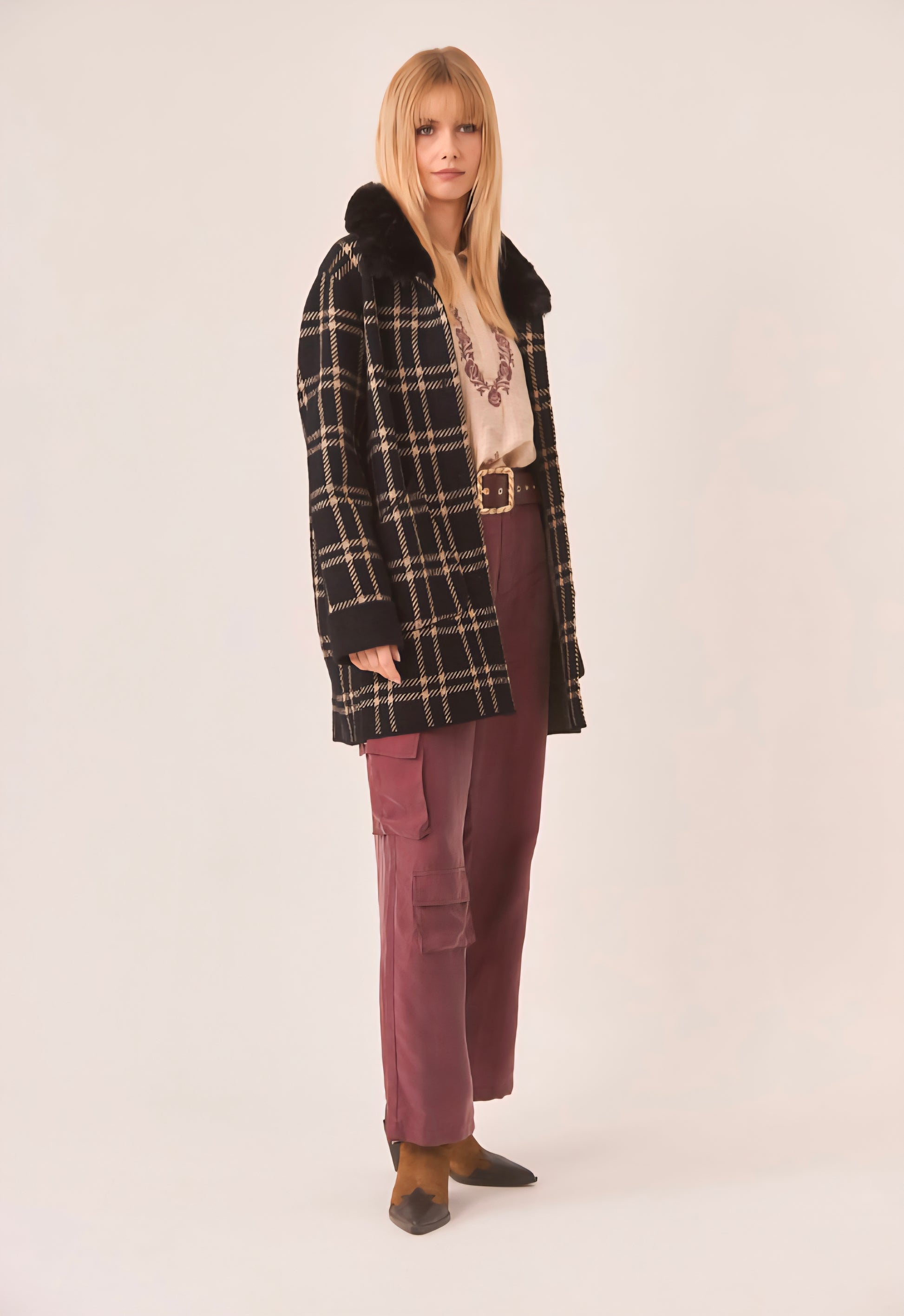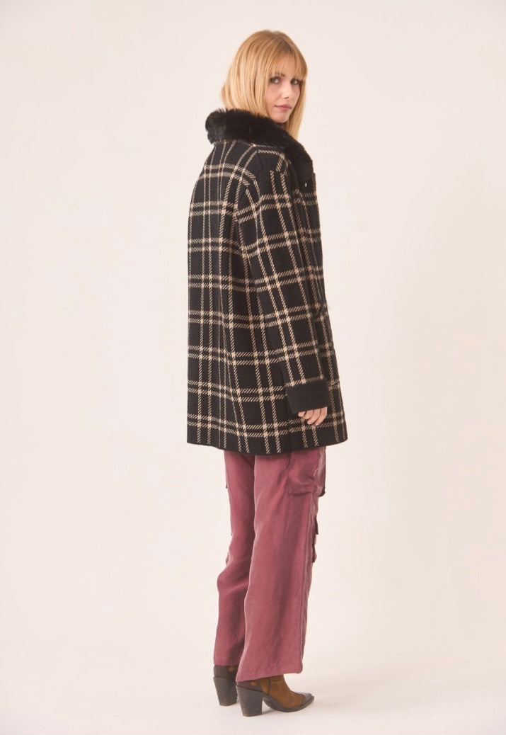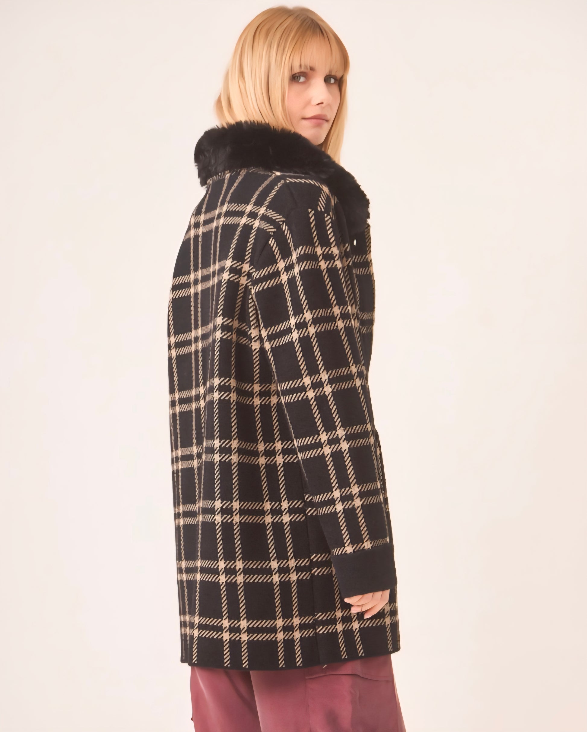 Casaco xadrez com bolsos. Detalhe de pêlo na gola e nos punhos.