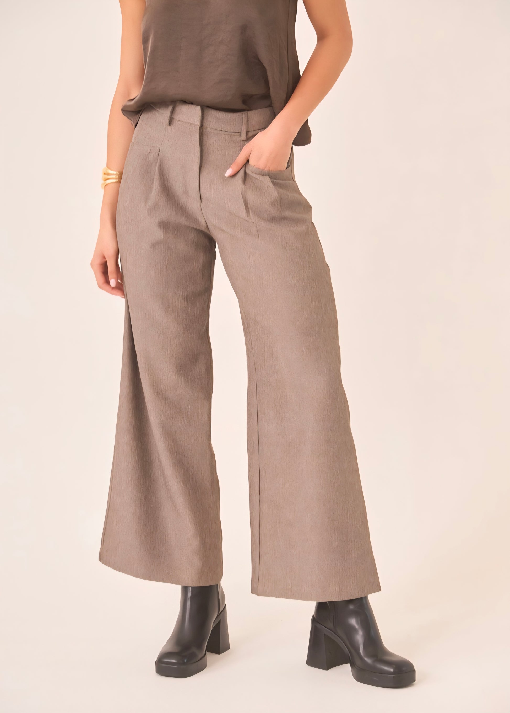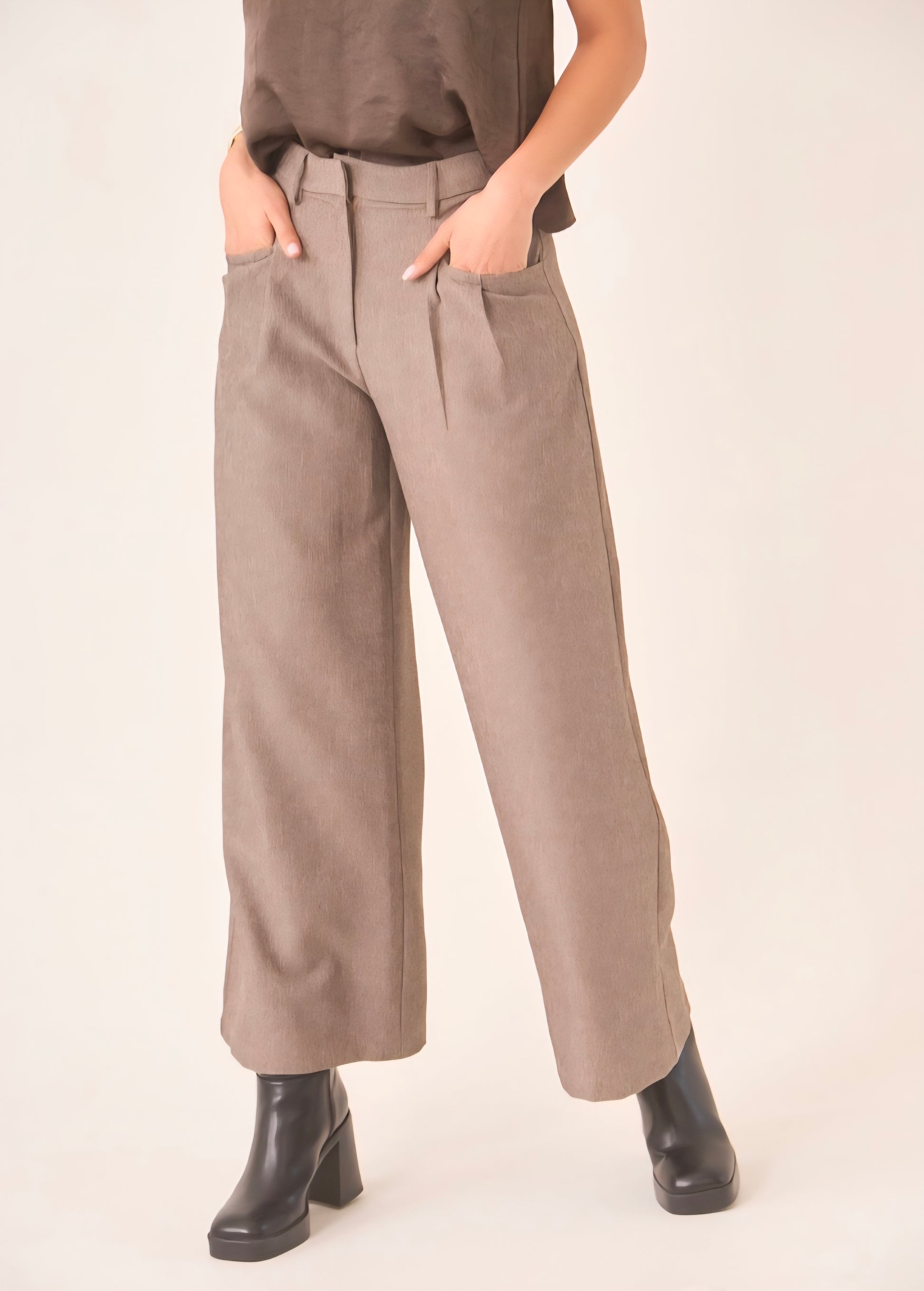 Calças de perna larga com bolsos frontais e fecho ziper e botão