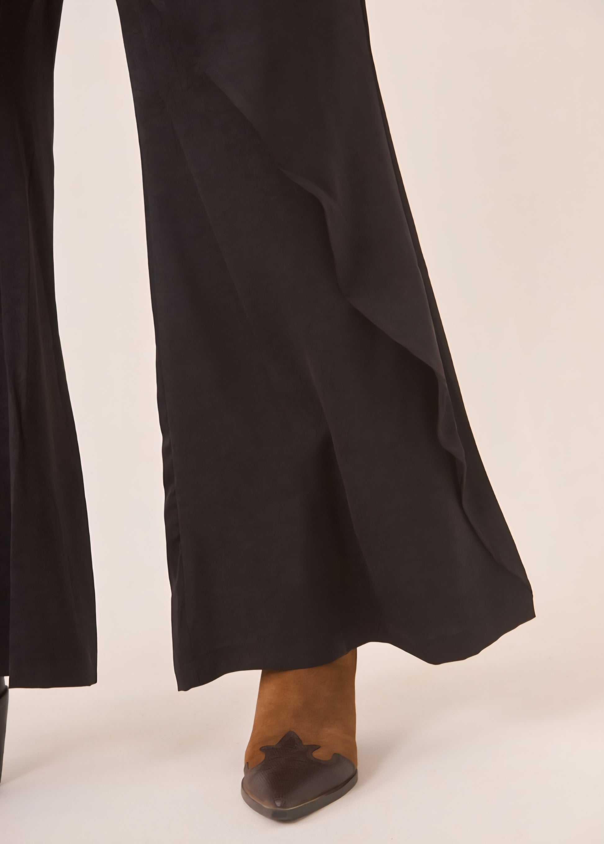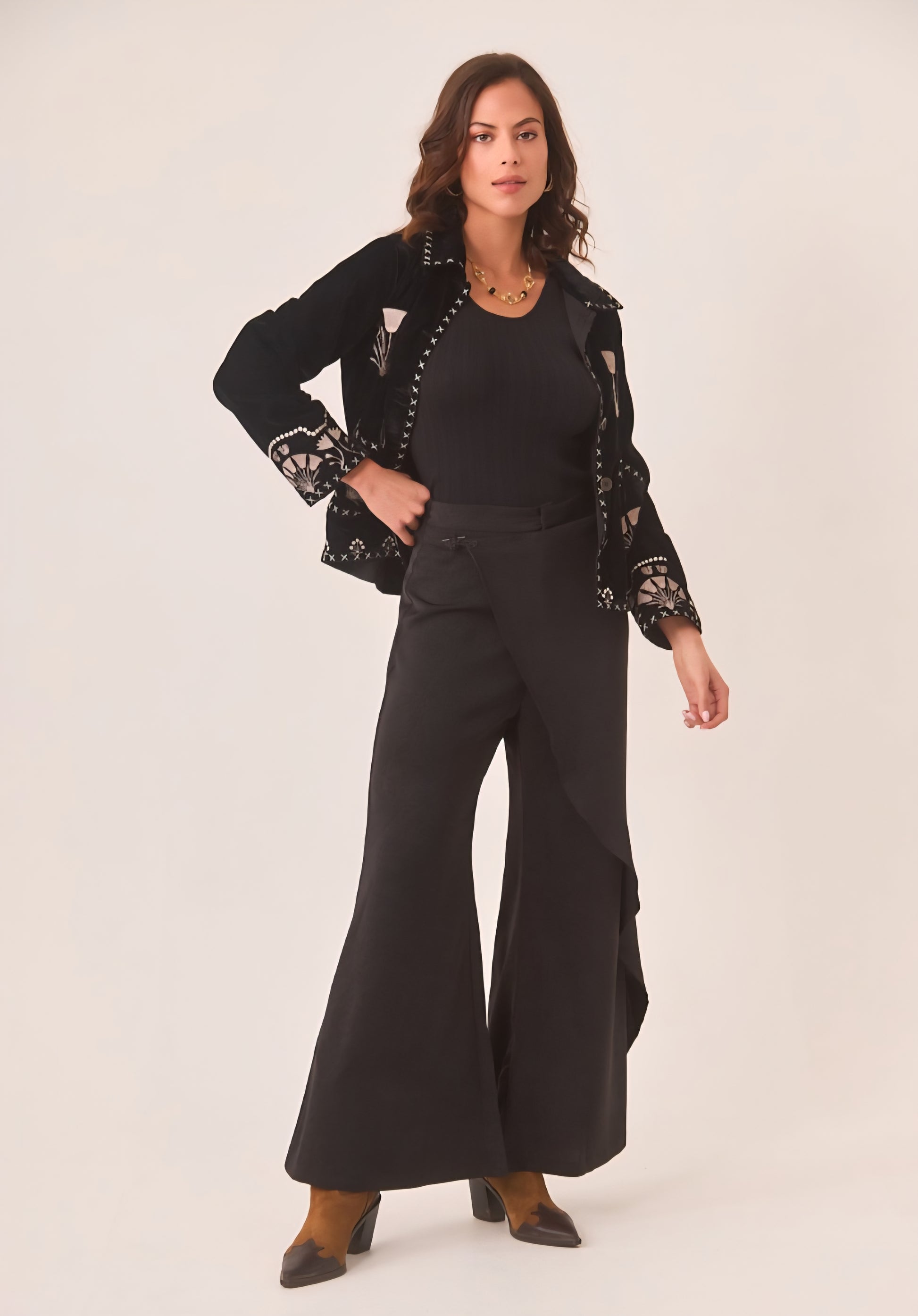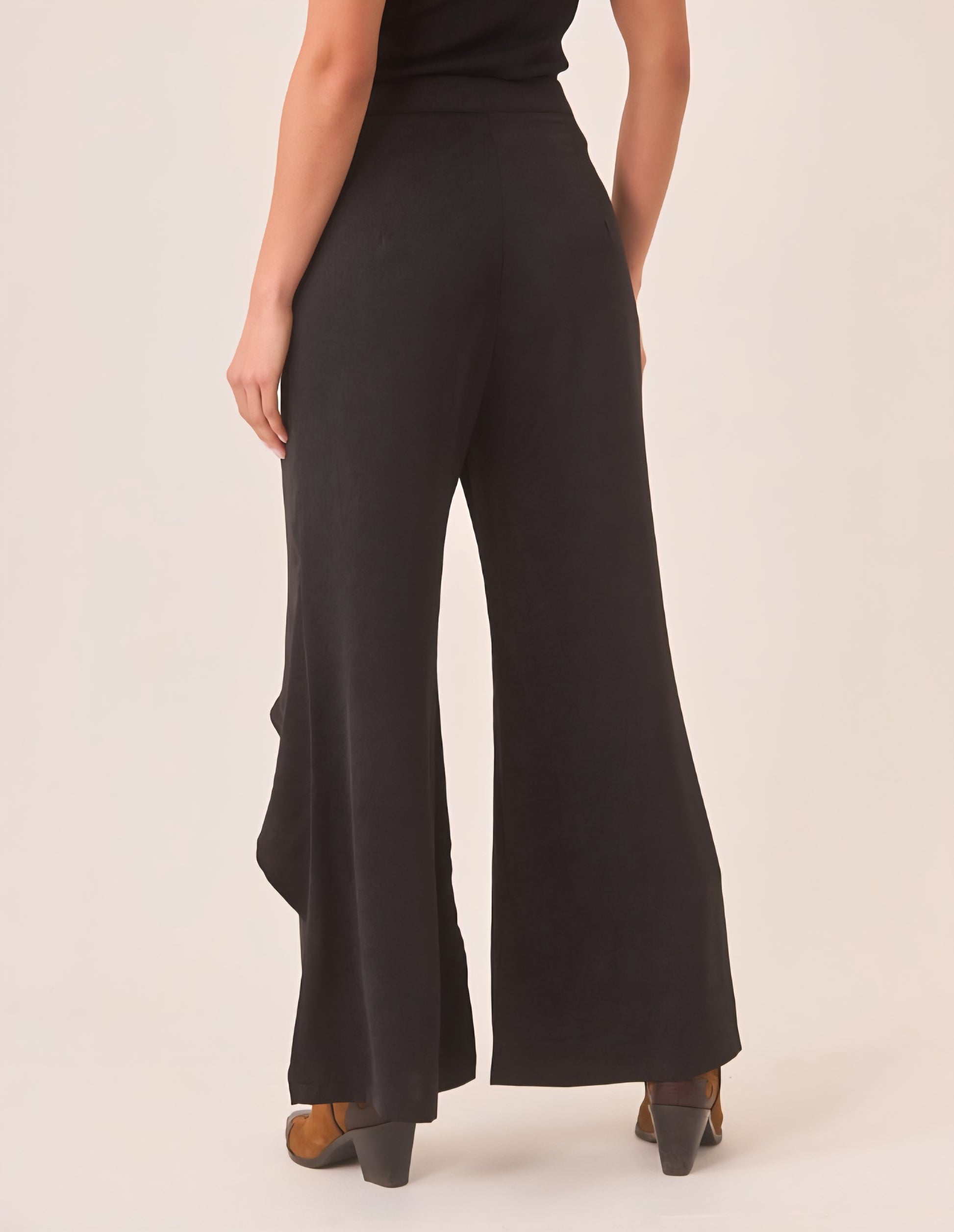 Calças estilo sarong flutuantes com fecho de frente
